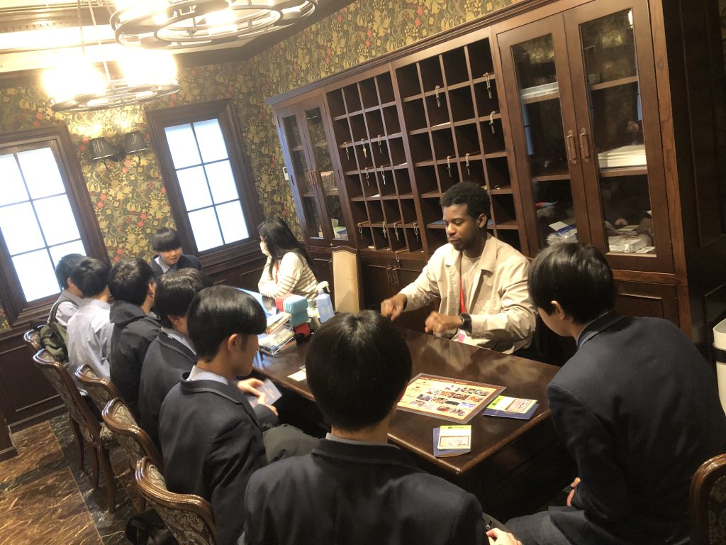 午前中から一日使ってTGG研修に行ってきました。生徒8人1グループにネイティブの先生が1人つく形で、ホテル・薬局・旅行会社など日常生活の場や仕事を体験しながら、また、ダンスやゲームなどのアクティビティを行いながら英会話による学習をします。
